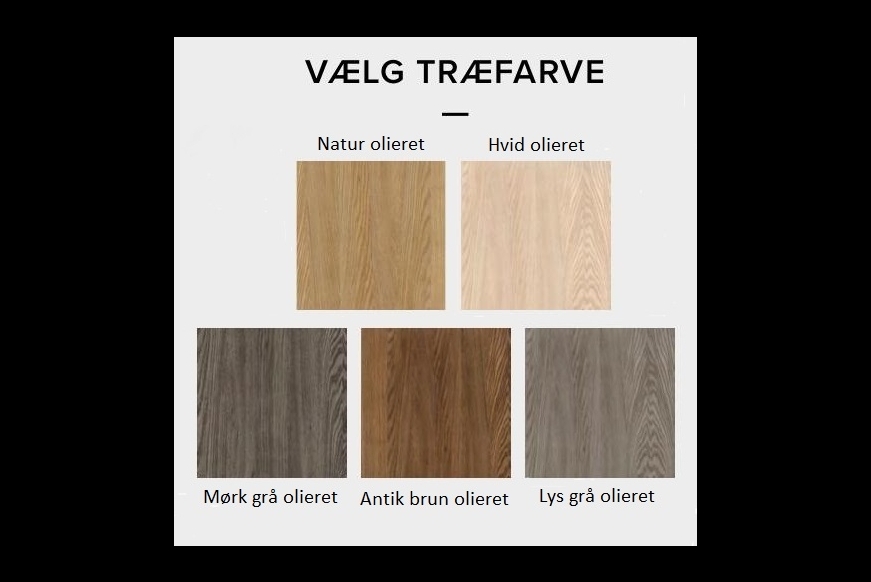 Bordet kan fås i mange forskellige behandlinger, vi har udvalgt 5 farver, som du kan vælge imellem her på hjemmesiden.