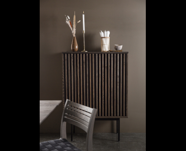 AKUSTIK SKAB fra Kristensen & Kristensen er designet med ønske om at forbedre akustikken i boligen samt opretholde et pænt udtryk. Kombinationen af trælameller og filt, er ikke blot tænkt ind i designet for at fornøje øjet, men i lige så høj grad for at absorbere rumklang. Skabet er vist her i massiv hvidolieret ask med sort metal sokkel.