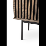 AKUSTIK HIGHBOARD fra Kristensen & Kristensen er designet med ønske om at forbedre akustikken i boligen samt opretholde et pænt udtryk. Kombinationen af trælameller og filt, er ikke blot tænkt ind i designet for at fornøje øjet, men i lige så høj grad for at absorbere rumklang. Highboardet er vist her i massiv mørk grå olieret ask med sort metal sokkel.