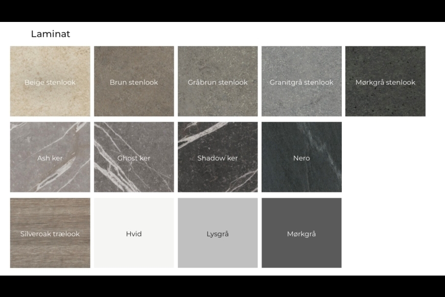 Til sidste skal du vælge hvilken laminatfarve du vil have bordpladen med, du kan se eksempler på farverne i billederne.