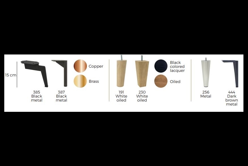 Der er 6 forskellige typer ben, som alle fås i 15 cm højde. Dertil er der mulighed for at vælge farve på de fleste typer.