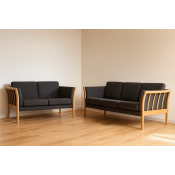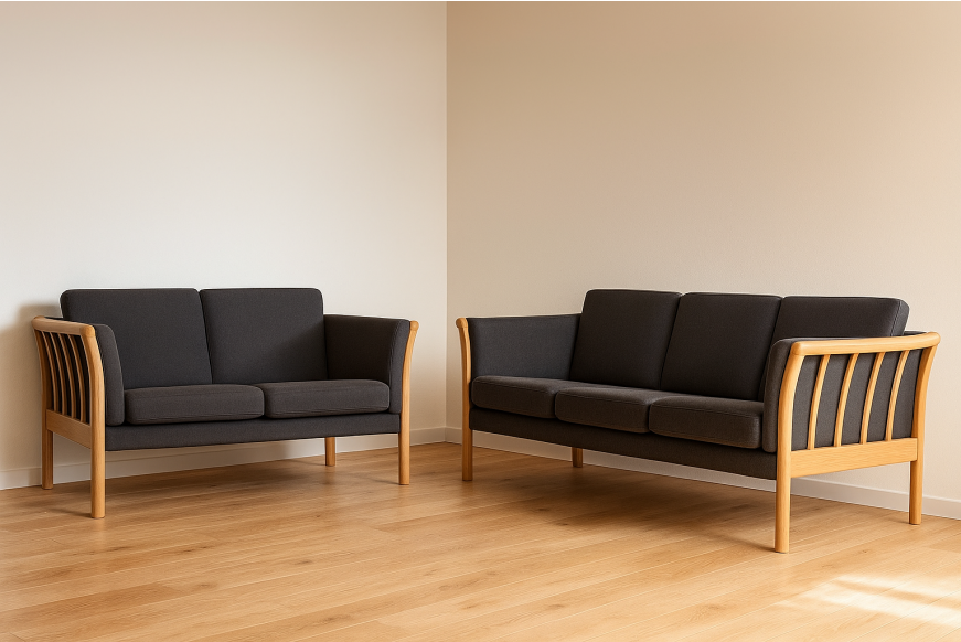 På billedet ses et 3 + 2 prs. Dorte sofasæt, med gråt uldbetræk Misha 432-04 og med bøge lak stel.