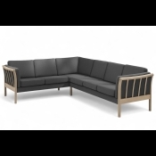 På billedet ses en 6 prs. Hjørne-Dorte sofa med lysegråt Misha uldbetræk, og ubehandlet egetræs stel. Opstillet med to Maria stole også fra Topline.